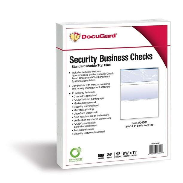 Docugard check paper walmart. Buy docugard prb04502 security business checks 5rm ct marble top green from walmart canada. Choose from a variety of manual checks self inking address stamps business envelopes check registers and deposit solutions. Docugard business checks are compatible with quicken quickbooks versacheck and other popular accounting payroll money management programs. Features up to 10 security features that help prevent tampering and unauthorized copies.
