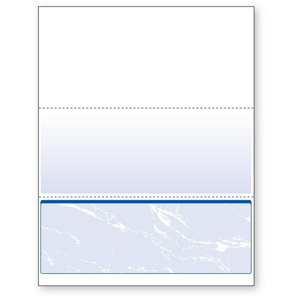 Docugard blank check paper is guaranteed to run jam free on desktop and high volume production inkjet and laser devices checks are located at the top of the sheet 3 5 tall x 8 5 wide and there are 2 horizontal perforations located at 3 5 and 7 from the top.