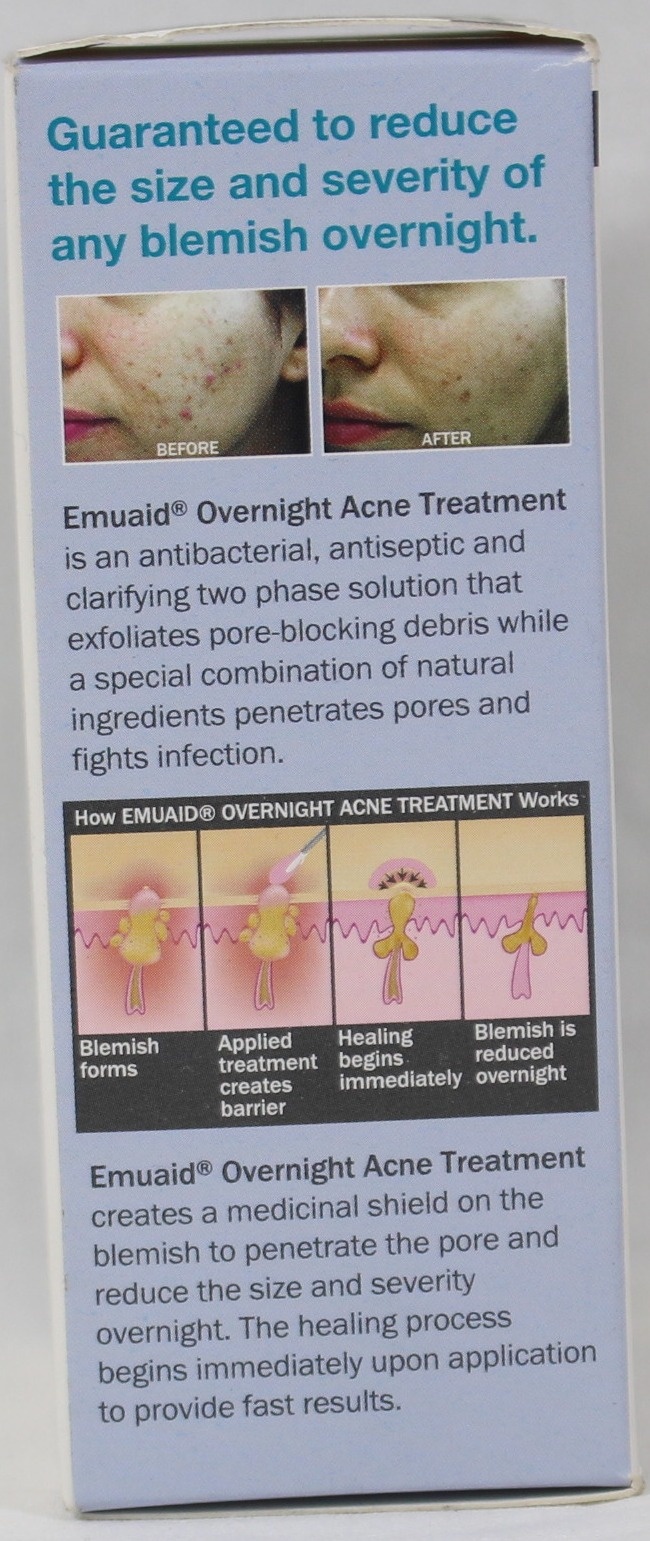 As an antibacterial antiseptic and clarifying acne solution it helps to clear your skin of toxins that can trigger acne outbreaks. Emuaid overnight acne treatment is an antibacterial antiseptic and clarifying two phase acne solution that can help to reduce the size and severity of any blemish overnight. Emuaid combines the healing power of emu oil and several other therapeutic nutrients to provide a safe and natural alternative to over counter creams and salves.